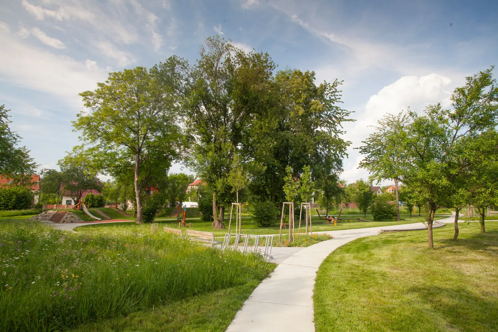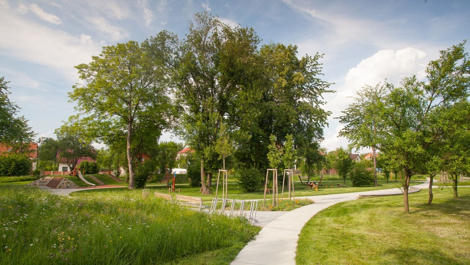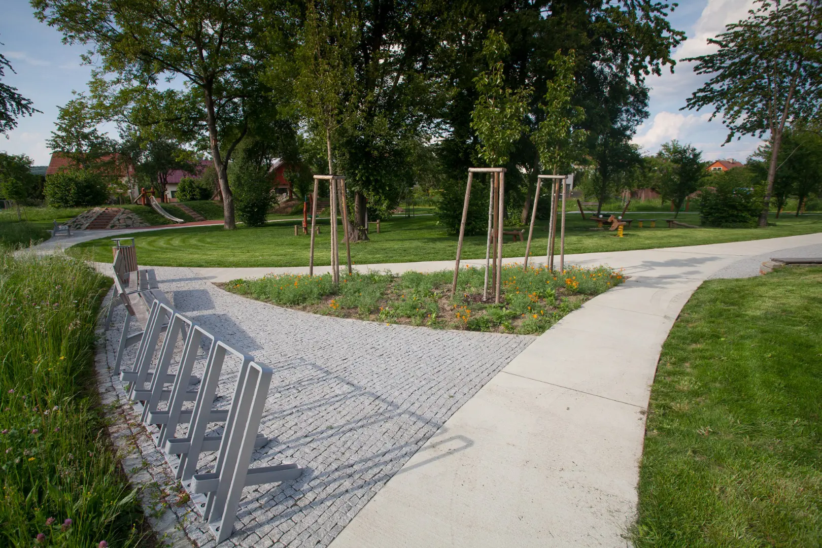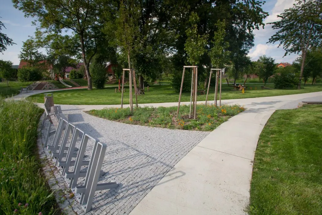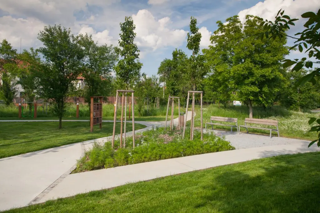U odpočívadel vznikly květinové záhony osázené výsevem směsí rostlin, které kvetou postupně v průběhu sezóny. V centrální části parku a v okolí herních prvků byla použita travobylinná směs, která není určena k udržování v podobě anglického trávníku, ale je odolná vůči sešlapu a nevyžaduje pravidelnou závlahu ani chemické ošetřování.