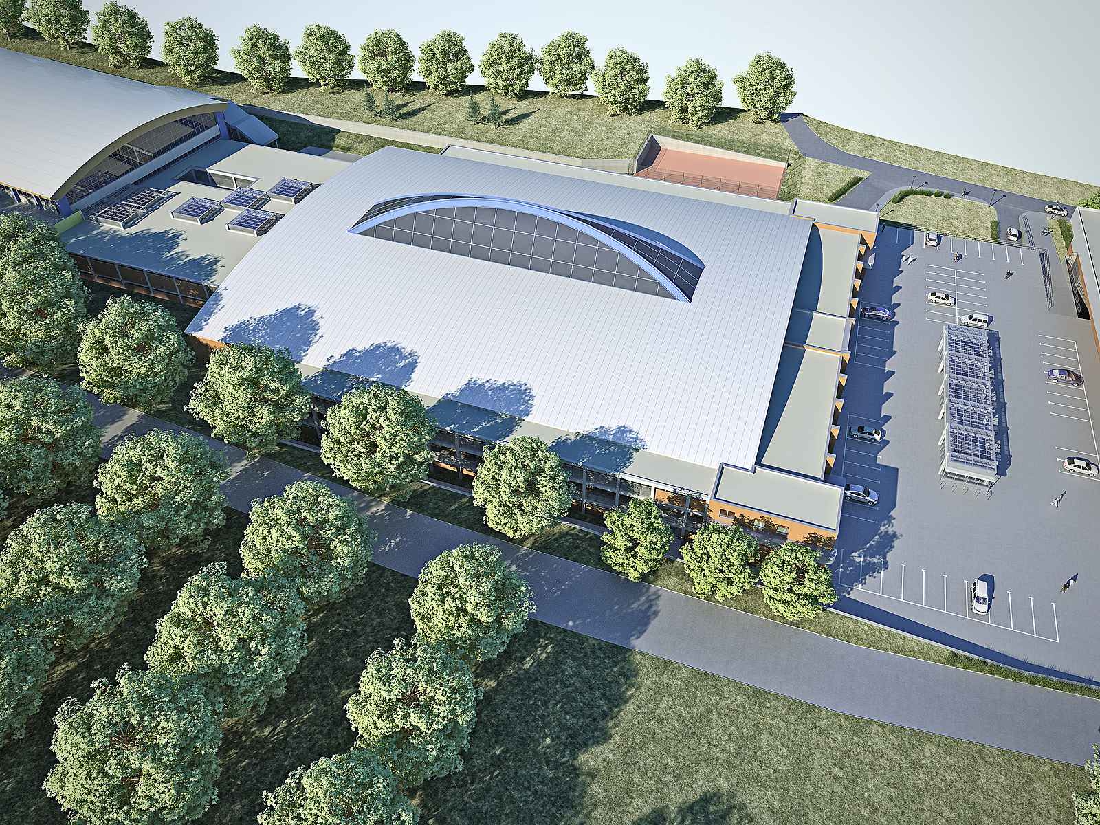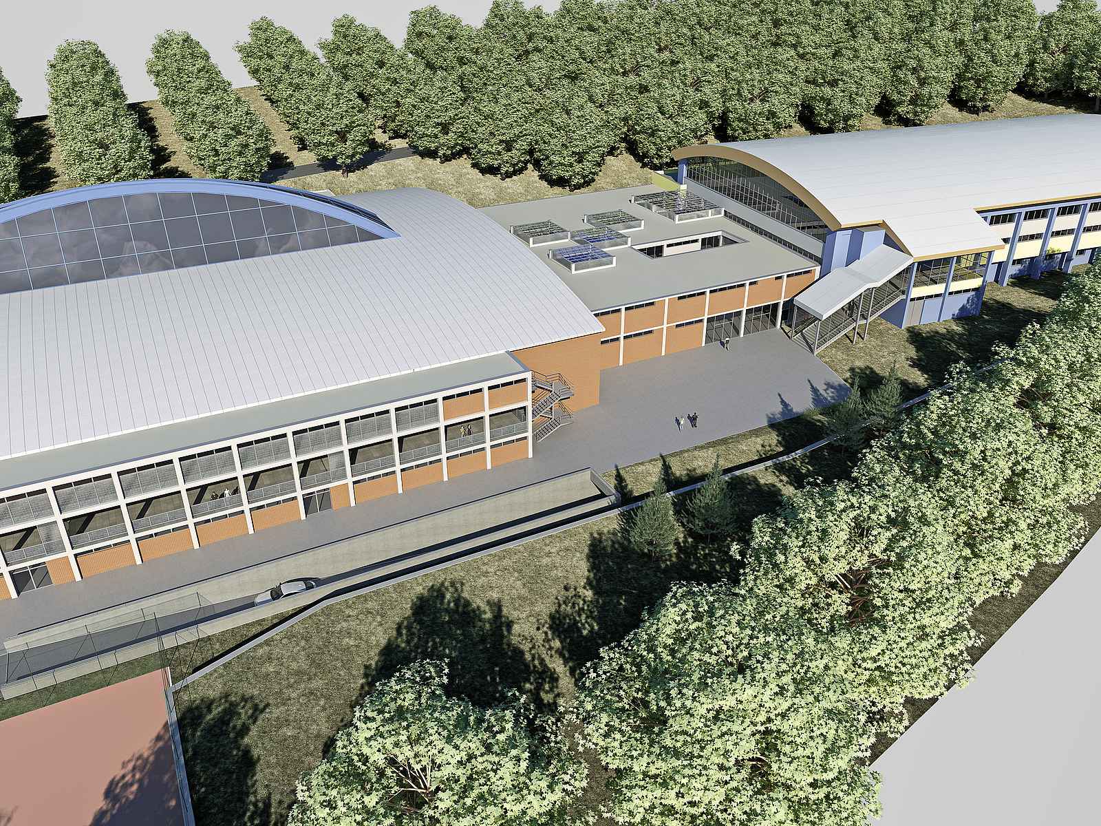 V přízemí dvoupatrové budovy vznikne parkoviště a zázemí pro rolbu, která bude z těchto míst obsluhovat obě haly, přičemž výškový rozdíl bude překonávat výtahem. Druhé patro počítá s umístěním šaten pro mládežnické týmy, které zajistí dobrou dostupnost na led na obou halách. Na tomto místě vznikne také tiskové středisko.