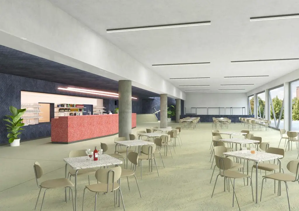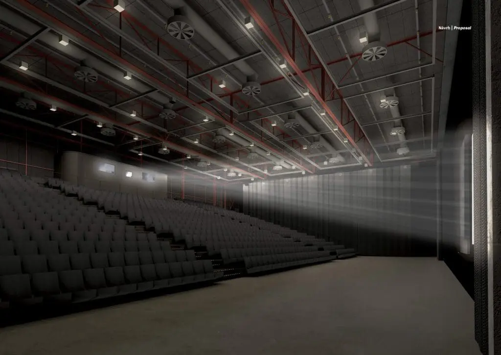 Uvnitř objektu dojde k demolici původní dispozice a vložení nových funkčních bloků – malého sálu a promítací kabiny, stejně jako zahloubeného přízemí se zázemím. Nové části budou realizovány převážně z monolitického železobetonu, místy v pohledové podobě.