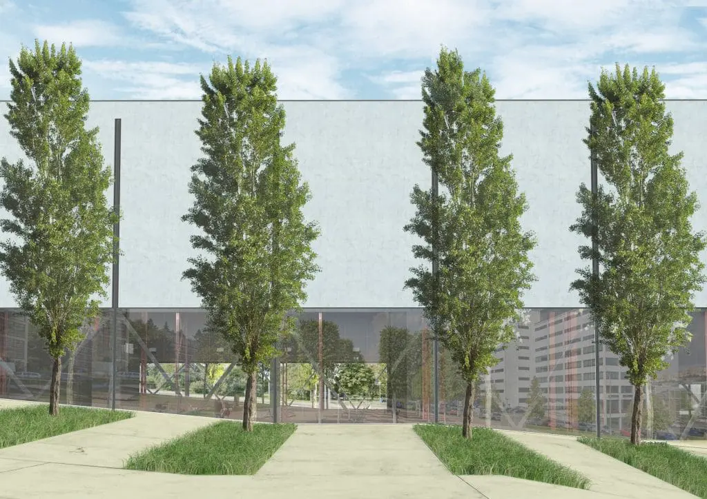 Z urbanistického hlediska se návrh výrazně neliší od stávající podoby a je v souladu s platnou územní regulací. Jedinou změnou tvaru budovy bude odstranění bočních křídel vstupní části na severní straně. Hlavní vstup zůstane na severu, boční vstupy budou nahrazeny novými výsuvnými a otevíracími okny. Na jižní fasádě vzniknou servisní vstupy a požární úniky.