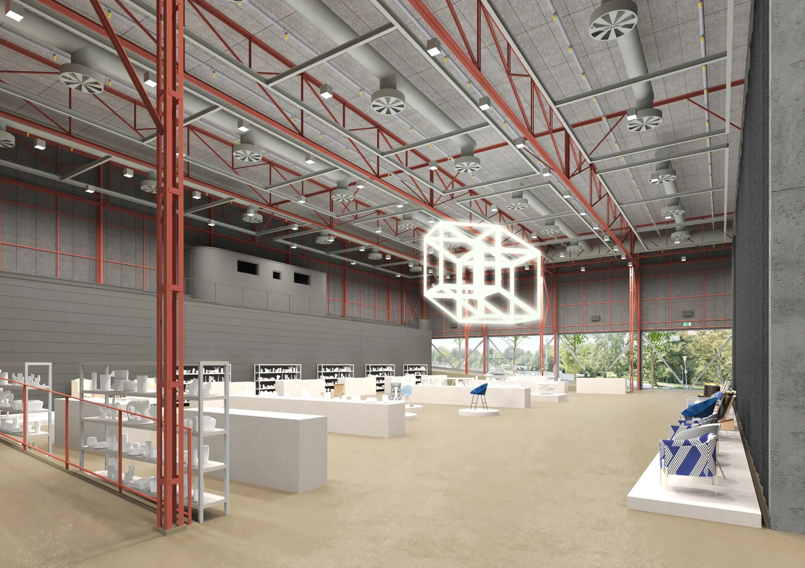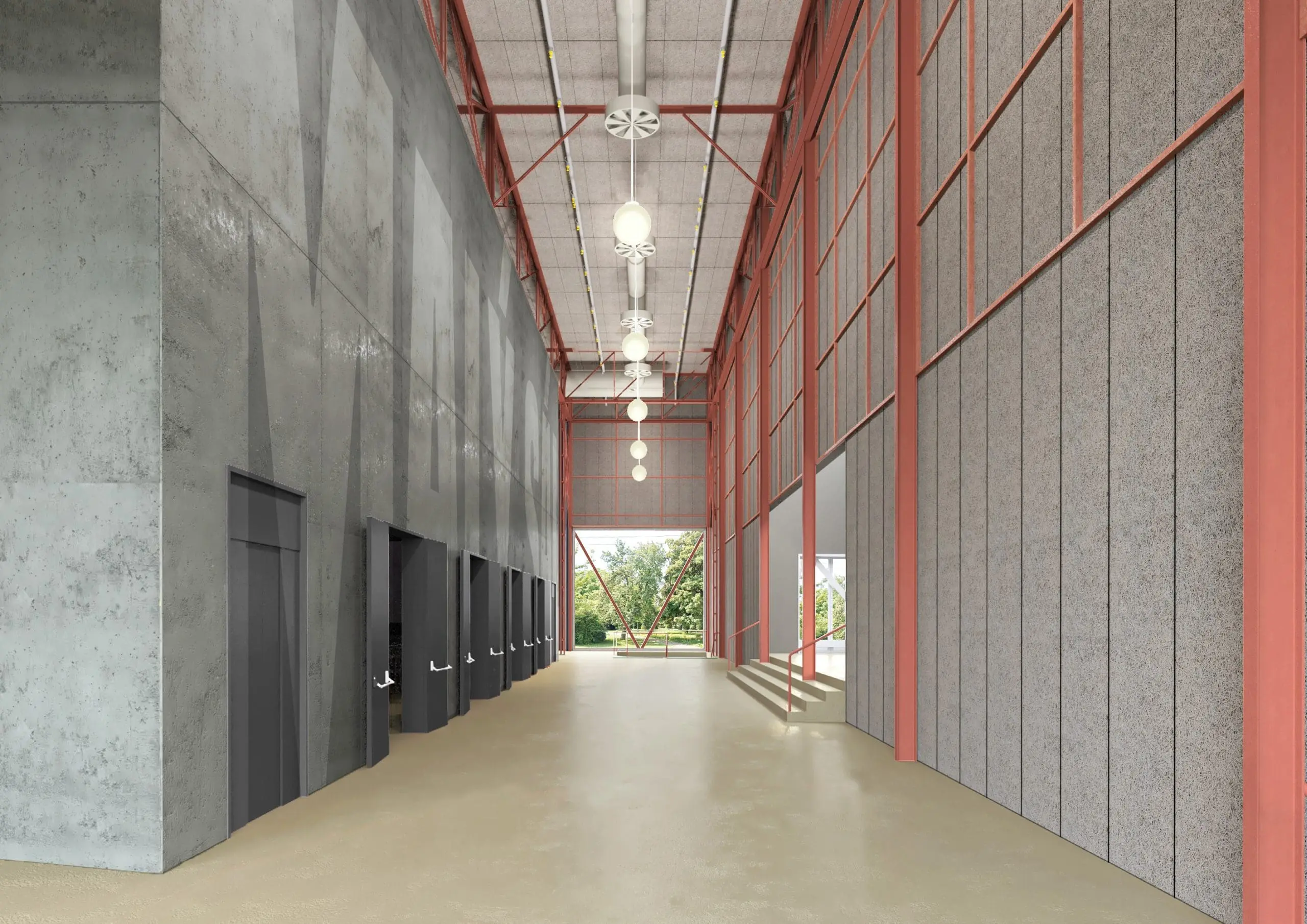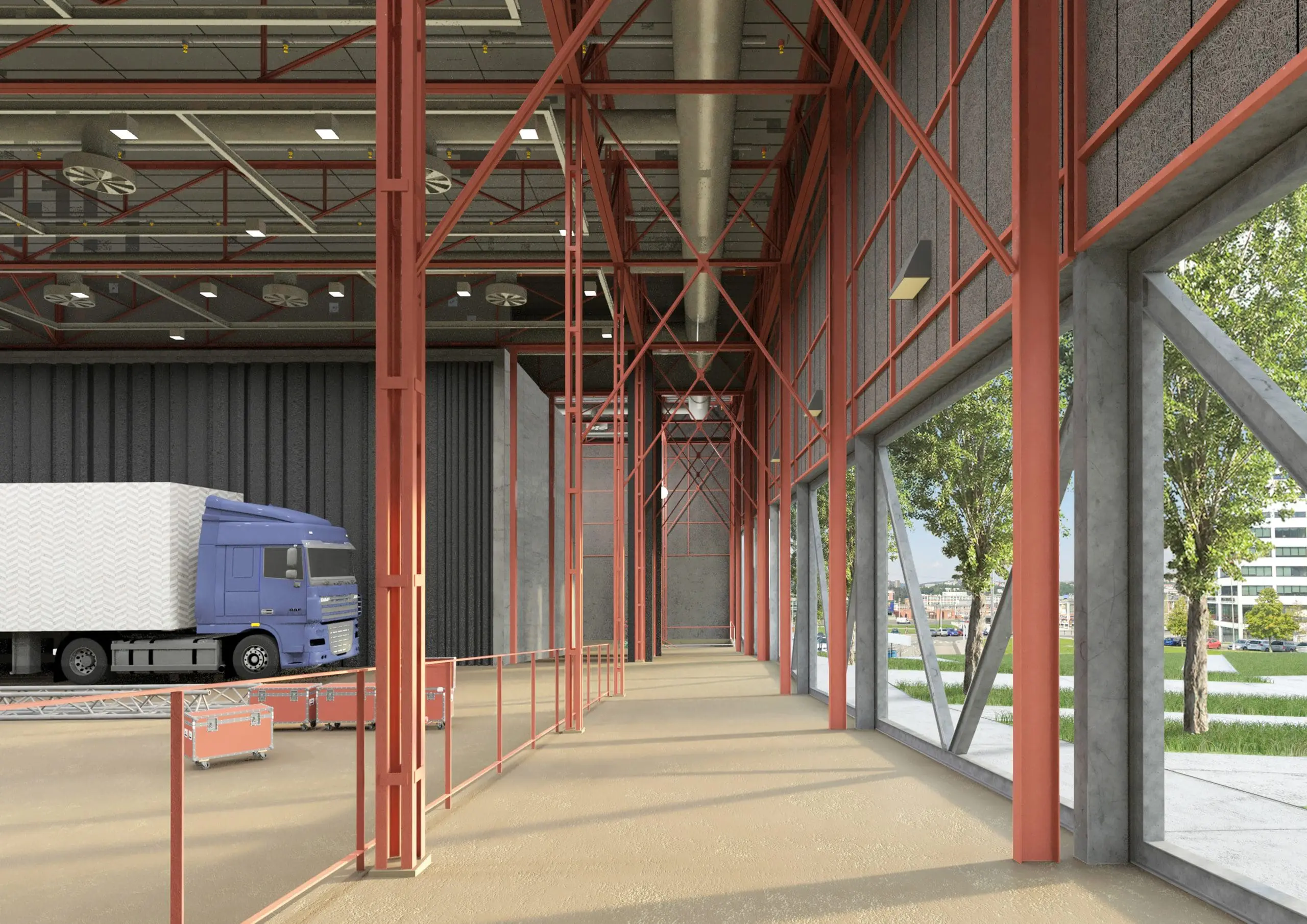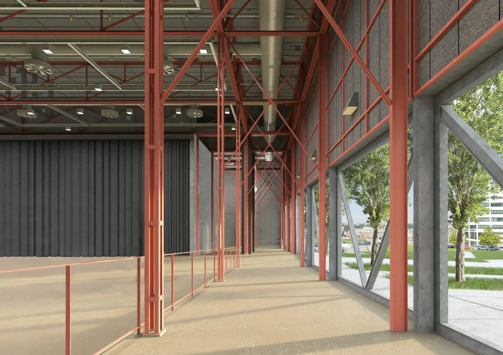 Základním principem projektu je zachování a ochrana stávající ocelové nosné konstrukce, která je kulturní památkou. Ta bude natřena červeným protipožárním nátěrem a zůstane v interiéru jasně čitelná. Současně bude doplněna novou vnější ocelovou konstrukcí, která zajistí potřebnou stabilitu a převezme zatížení.