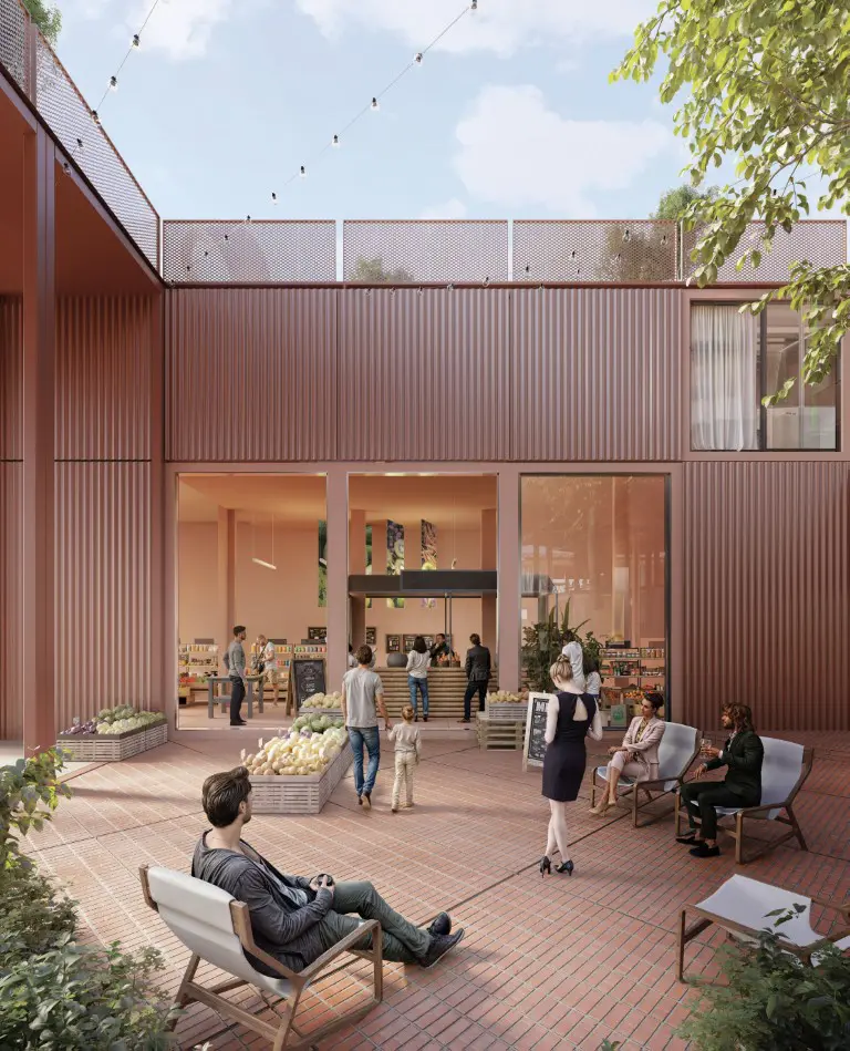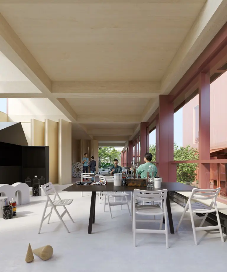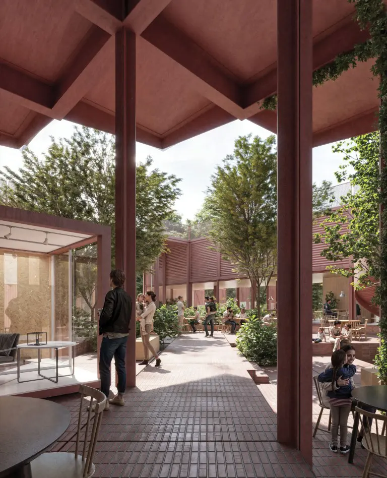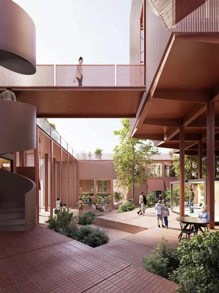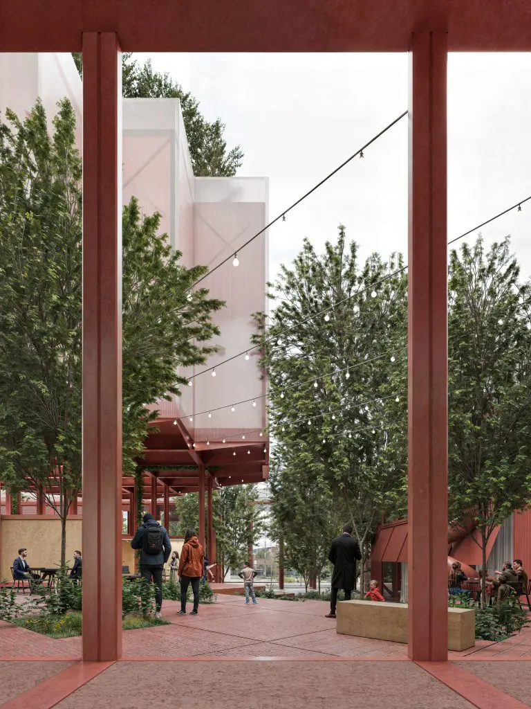 co-workingovým centrem. Náměstí uprostřed s mobilními moduly se dokáže přizpůsobit plánovaným akcím a kulturním představením.